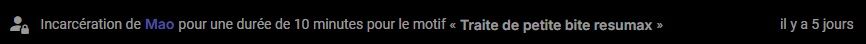 Incarcération de Mao pour une durée de 10 minutes pour le motif « Traite de petite bite resumax » il y a 5 jours