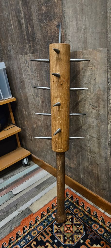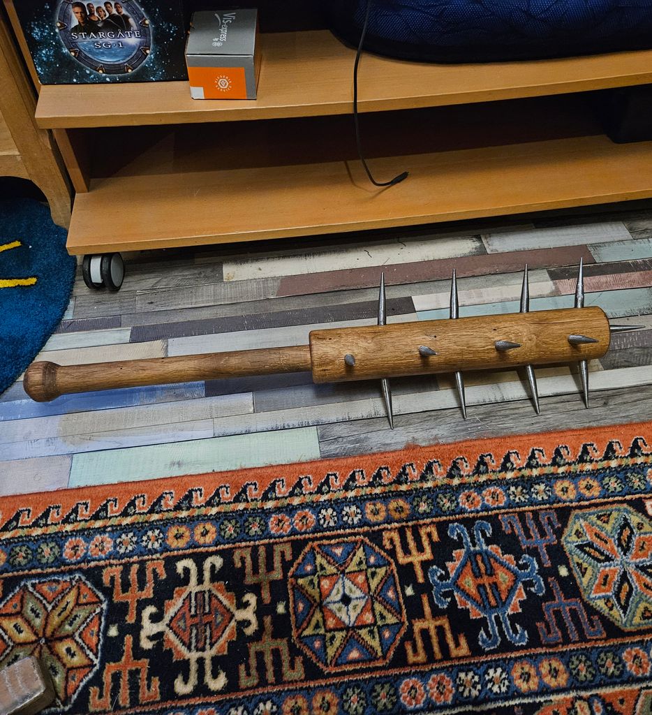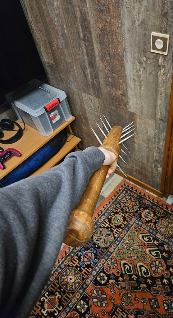 Bon la j'ai un peut craqué sur la taille et le poids elle est pas maniable a une main. Si j'en refais une un jour, elle sera plus courte, plus fine, et avec des piques en acier carbone (voir même trempé) pour être beaucoup plus solide.
