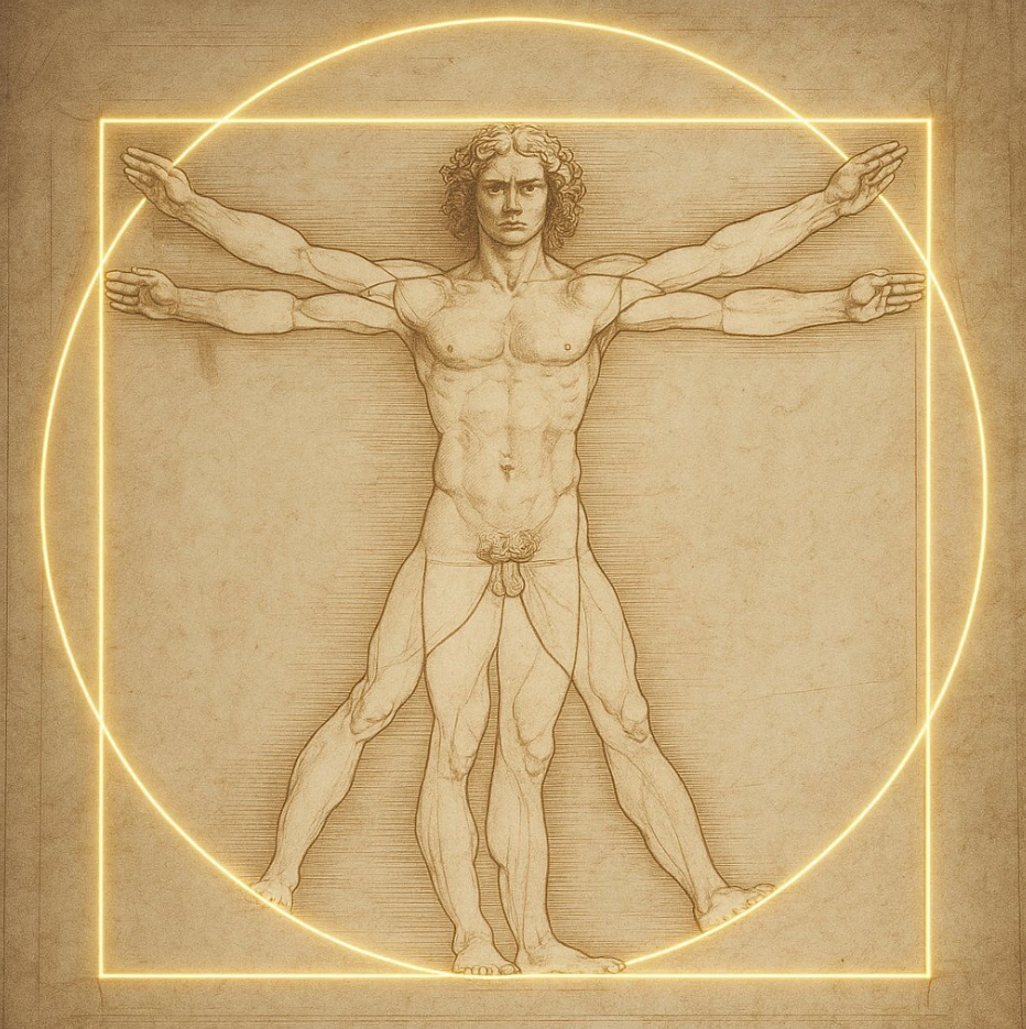 Ainsi, la géométrie, dans son sens le plus élevé, n'est pas une science de figures abstraites, mais un langage sacré par lequel l'initié lit l'esprit de Dieu. La figure de Vitruve témoigne silencieusement de cette vérité : l'homme, bien proportionné et bien ordonné, peut devenir le carrefour vivant de l'éternel et du temporel, un temple non pas construit de main d'homme, mais formé de chair et d'âme, selon le dessein divin.