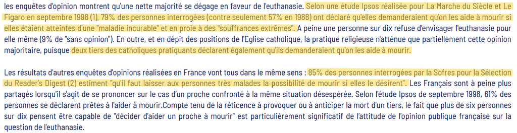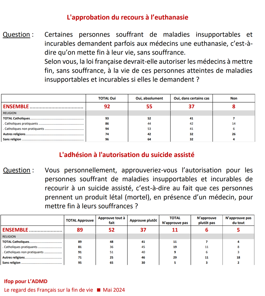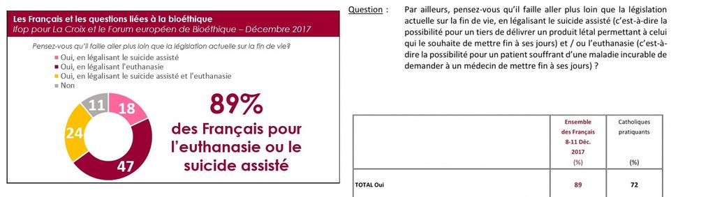 On est donc globalement sur du 80-90% pour et du 10-15% contre, même parmi les catholiques, une large majorité est en faveur de l’euthanasie / suicide assisté.