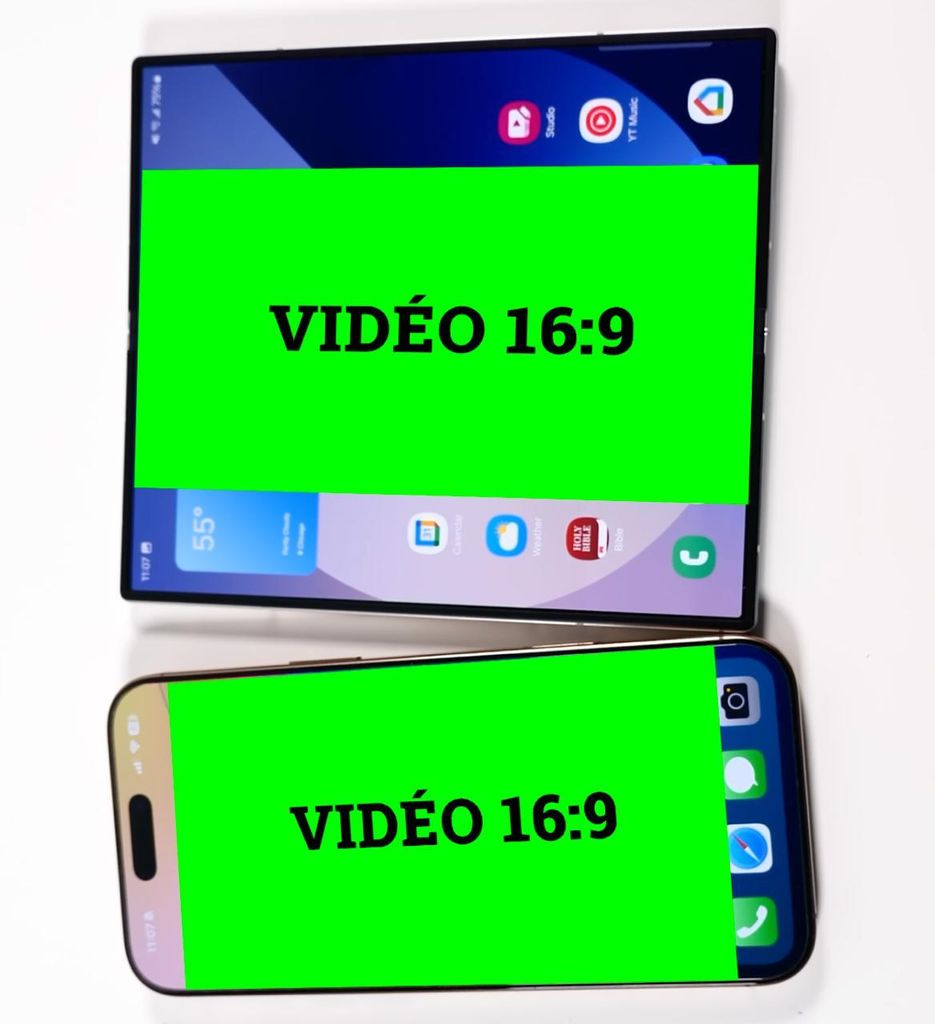Pour illustrer, on peu voir qu'une vidéo 16:9 est quasiment aussi grande sur un iPhone Pro Max que sur un Galaxy Fold :