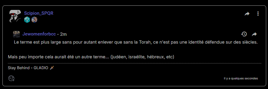Alors non, justement. J'ai déjà précisé le cas de ne pas confondre dans d'autres topics, l'histoire de France (dans le sens du mot juridique France et du peuple français à sa formation) commençant bien par des Francs pour rassembler des peuples gaulois progressivement. Mais là, ce que tu me dis n'est pas similaire. Dans le cas des Francs et des Gaulois, on ne dit pas, ce sont des groupes religieux. Alors que dans le cas des juifs, ce terme est religieux car il permet de définir juif et non juif parmi les Hébreux, Israélites et Judéens.