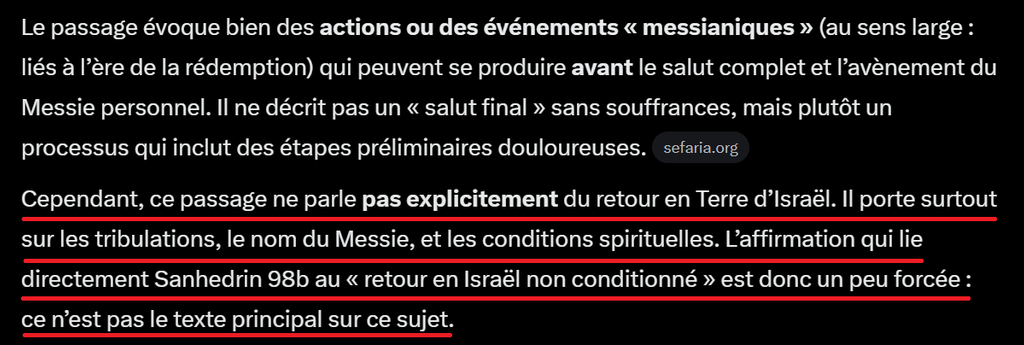 Par exemple, le Talmud de Babylone, Sanhedrin 98b évoque des actions messianiques pouvant précéder un salut final, et plusieurs passages du Midrash et de la littérature talmudique laissent entendre que le retour en Terre d’Israël n’est pas strictement conditionné à l’avènement du Messie, ce qui a permis aux autorités religieuses et aux penseurs sionistes ultérieurs de justifier un État juif avant l’arrivée messianique.