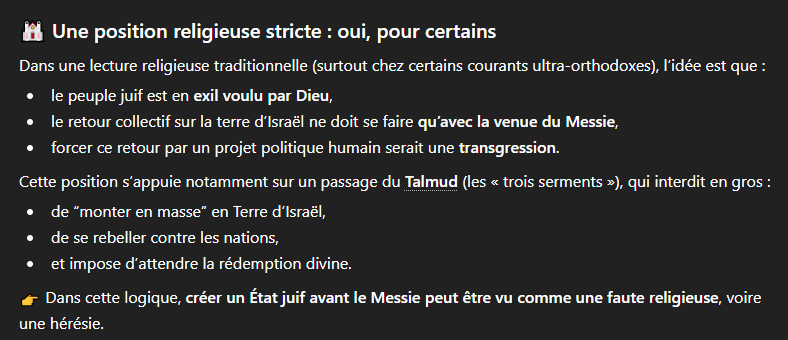 Est-ce que le sionisme découle du néant ou de l'athéisme, attardé ? Tu es conscient que l'idée d'un agenda religieux en Terre Promise entre pile dans celui du sionisme et que des rabbins ont initié ce sionisme, ce n'est pas le cas de quelques politiques israéliens.