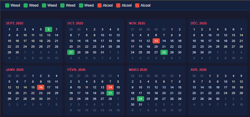 Pour moi tu peux mettre du vert tous les jours, alcool par contre je dois même pas être a une fois par mois sur une année.