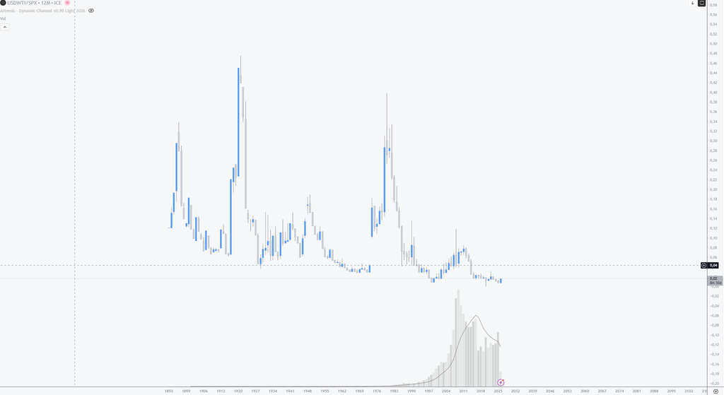 L'indice s&p 500 ayant surperformé le pétrole, il est normal que la fraction/paire oil/s&p ai été baissière (augmentation du dénominateur)