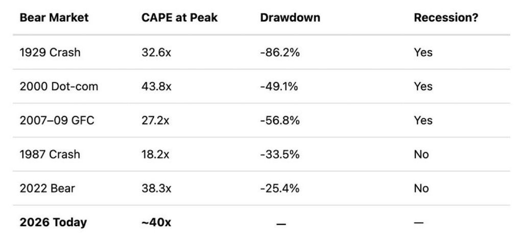 Le tableau s'appuie sur quatre colonnes pour comparer les différentes époques. La colonne "Bear Market" liste les grandes crises passées, tandis que le "CAPE at Peak" est un indicateur qui mesure la cherté des actions par rapport aux bénéfices des entreprises. Enfin, "Drawdown" indique le pourcentage de perte maximale de la bourse lors de ces crises, et "Recession?" précise si l'économie réelle est également entrée en crise.