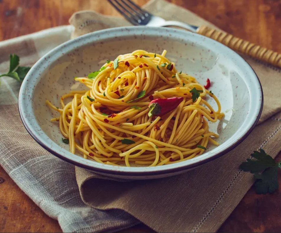 Aglio e oilio ( ail, poivre, huile d'olive, piments, chapelure, persil, parmesan + vous pouvez mettre des anchois dans l'huile pour au début ajouter du gout )
