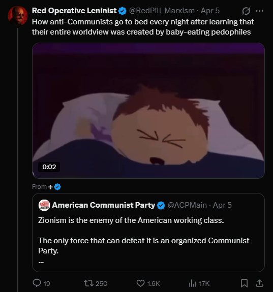 Faut arrêter de faire le jeu des gogoles marxistes que je vois tous les jours sur twitter jouer le refrain de "l'Occident l'axe pédo-asataniste contre le monde joyeux des communistes gentils..."