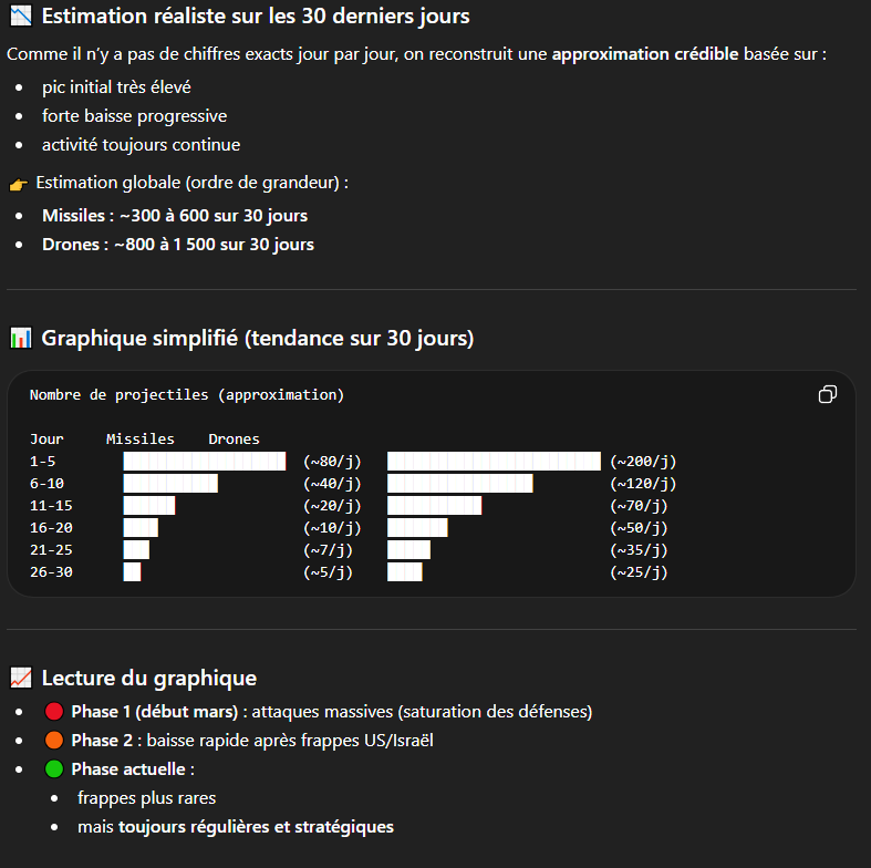 De l'autre côté les iraniens sont à bout de souffle et tir de manière de plus en plus limitée leurs missiles et drônes :