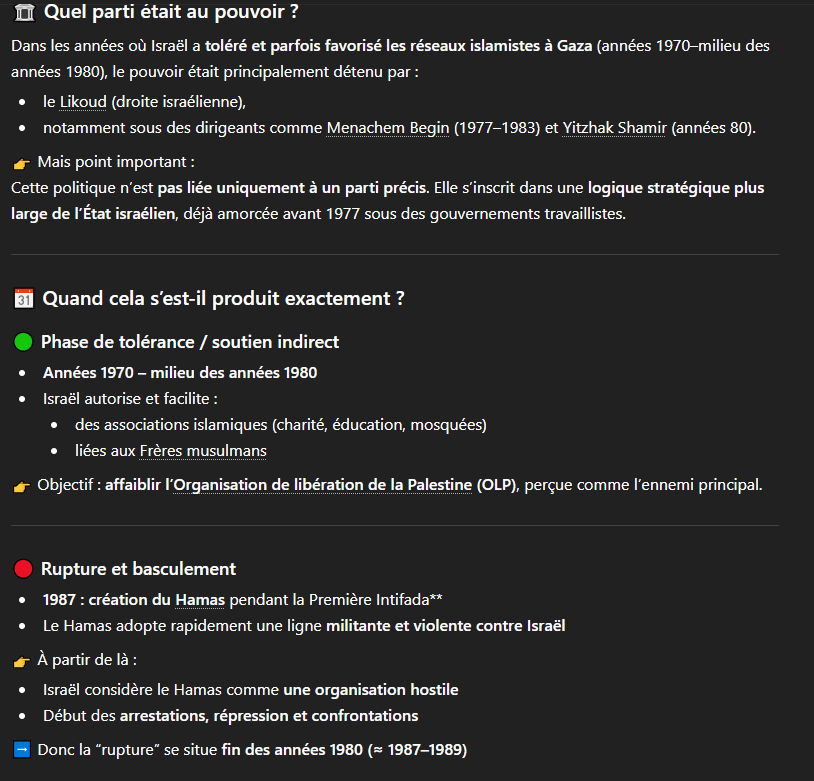 Israël a activement favorisé l’essor des islamistes (précurseur du Hamas) pour diviser les Palestiniens et affaiblir l’OLP/Fatah. C’est une stratégie classique de « diviser pour régner » reconnue par plusieurs anciens officiels israéliens.
