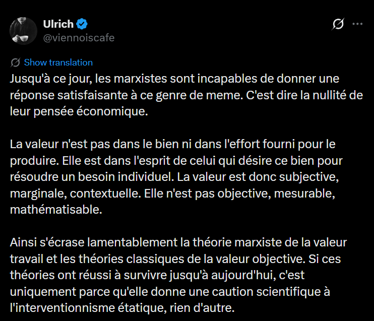 Ca depend de si on parle de la valeure d'usage ou de la valeur marchande. Faire cette distinction permet justement de donner des outils pour éradiqué les activités néfastes comme la pornographie ou onlyfan, ce que le capitalisme n'a jamais pu réaliser.