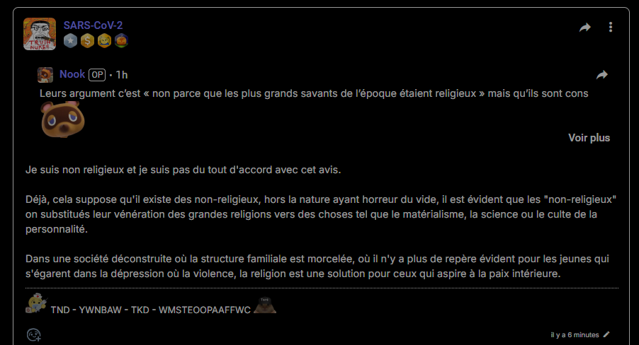 Juste, c'est découvert et comme ça respecte des étapes qui nous permettent d'avoir un minimum de compréhension sur l'univers, on avance. Un religieux passe surtout pour un con en disant à la fois valider des découvertes pour ensuite dire que les sciences seraient un culte, etc. C'est surtout que les sciences posent un souci aux religieux quand ça va pas dans le sens de leur dogme, donc forcément que ça va partir sur des affirmations que ça remplace la religion... Les sciences ne remplacent pas la religion, tu sais des choses, tu prouves telle chose et tu fais ta vie, il n'y a pas de culte.