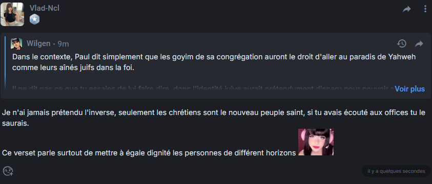 Je reprenais aussi l'auteur du poste car celui si, il y'a quelques temps, disait qu'il ne considérait pas les non-chrétiens comme ses frères et donc que les personnes non sainte n'ont pas besoin de compassion, chose que je relève de plus en plus avec ces pensées dites "chrétienne" de nouvelle vague, ou le christianisme gen Z