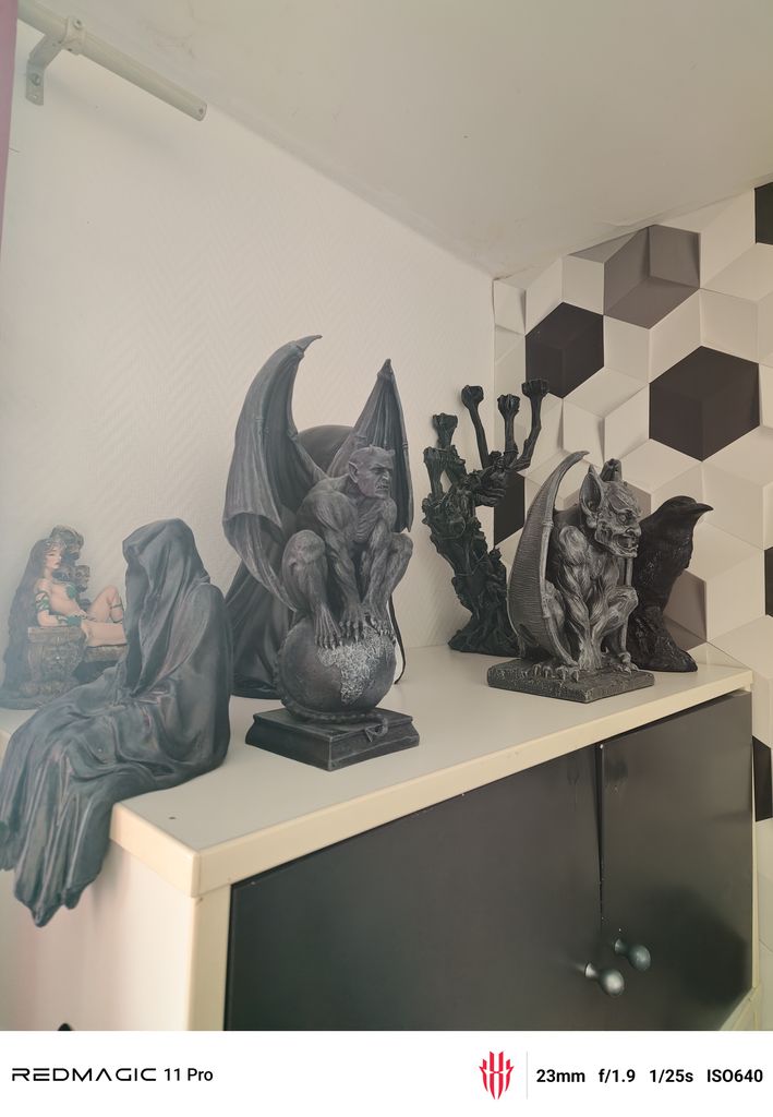 si je peux mz permettre tu pourrais faire un truc plus original avec tes gargouilles en modifiant ton meuble, genre tu fais une vraie voûte gothique avec du carton pour l’entourer jsp