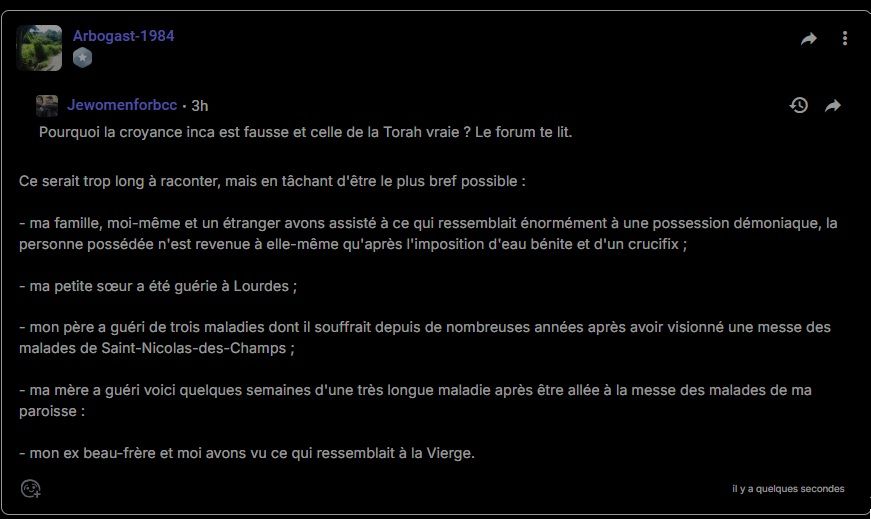 En science comme en histoire, ce qui distingue un fait établi d’un témoignage, c’est la vérifiabilité indépendante et reproductible, or ces événements, par nature, n’offrent ni contrôle, ni comparaison, ni preuve externe. Ils peuvent avoir une valeur personnelle ou spirituelle, mais ne permettent pas de conclure de manière universelle à une intervention surnaturelle. N'importe quel gourou venant de culte peu reconnu peut invoquer tes fameuses expériences, etc. en disant à d'autres individus d'en dire autant. Les groupes religieux font ça en concurrence pour la propagande. La réalité, c'est que ce sont des avancées médicales sans dogme religieux qui permettent des soins, ensuite, selon les individus, tu peux avoir des cas exceptionnels mais ça valide rien en terme de contenu sur telle religion.