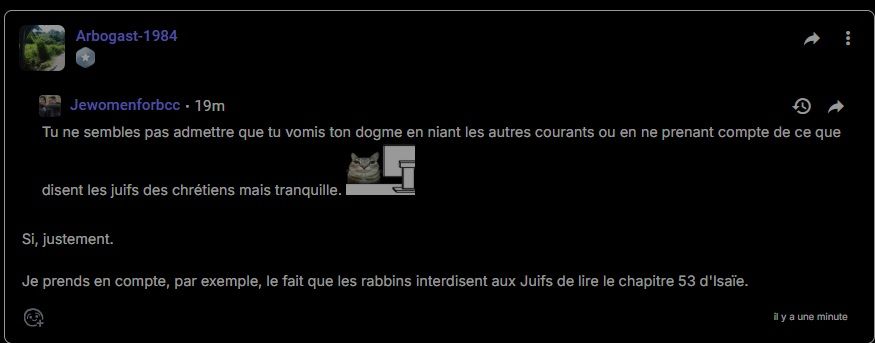 Tu ne sembles pas admettre que tu vomis ton dogme en niant les autres courants ou en ne prenant compte de ce que disent les juifs des chrétiens mais tranquille.