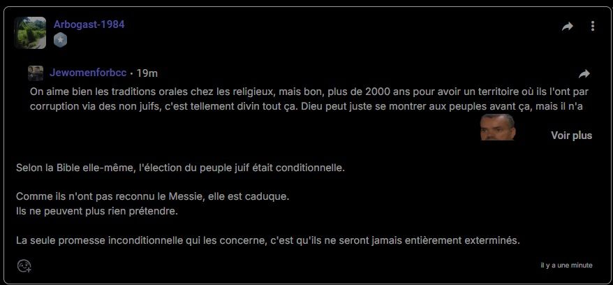 Ce raisonnement donne une apparence de cohérence interne, mais il repose sur une confusion majeure entre catégories religieuses, historiques et politiques. Le dit peuple juif dans la Torah ou la Bible est d’abord une catégorie religieuse et théologique, structurée par une alliance, une loi et un récit spirituel, et non un peuple au sens d’une continuité territoriale, linguistique ou ethnique homogène, tu as du juif turc, maghrébin, noir africain, arabe, slave, conversion sur des siècles, éparpillement.
