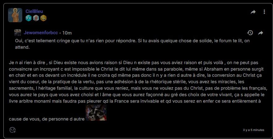 Tu simplifies abusivement la question en opposant seulement croyance et non-croyance, sans tenir compte de la diversité des religions et tu mélanges foi personnelle, menaces morales et jugements collectifs, ce qui relève davantage de la pression émotionnelle que d’un raisonnement. Enfin, tu supposes que ne pas croire serait un refus volontaire ou une faute, alors que c’est souvent simplement une absence de conviction face aux preuves proposées, ce qui fragilise fortement la prétention du discours à être rationnel ou universel.