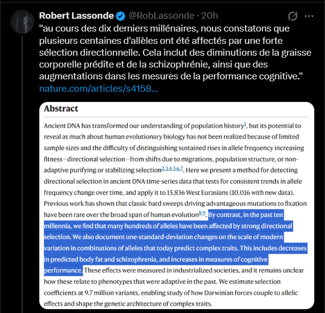 Aujourd'hui, l’étude la plus massive de l’histoire (15 836 génomes anciens) vient de lui donner raison. La science confirme que l’évolution humaine ne s’est pas arrêtée : elle s’est ACCÉLÉRÉE MASSIVEMENT depuis 10 000 ans, provoquant une divergence biologique réelle dans l’intelligence et les comportements.