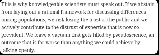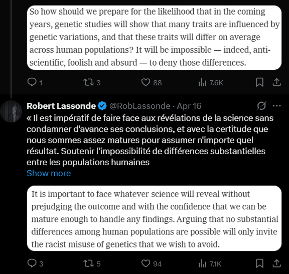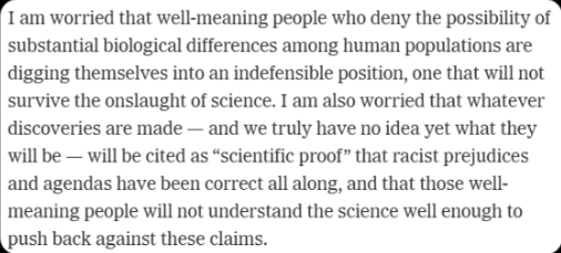 Il est tellement "raciste" qu'il se préoccupe qu'en cachant la vérité scientifique cela profiterait aux racistes car la science va irrémédiablement leur donner raison in fine...