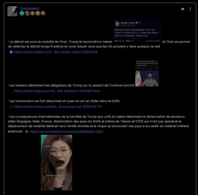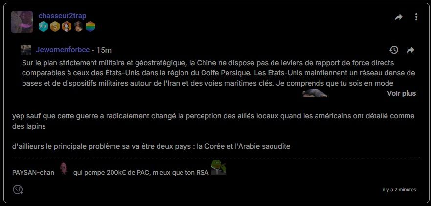 Les faits observables vont même dans le sens inverse, certains navires chinois ont évité la zone ou fait demi-tour face aux tensions. Sinon, l’Iran a publiquement annoncé l’accès au détroit. La Chine serait si forte qu'elle peut faire ce qu'elle veut ? On en apprend tous les jours avec vous.