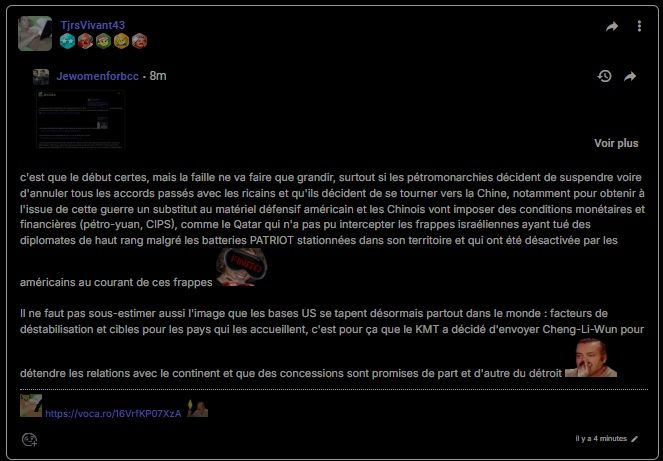 c'est que le début certes, mais la faille ne va faire que grandir, surtout si les pétromonarchies décident de suspendre voire d'annuler tous les accords passés avec les ricains et qu'ils décident de se tourner vers la Chine, notamment pour obtenir à l'issue de cette guerre un substitut au matériel défensif américain et les Chinois vont imposer des conditions monétaires et financières (pétro-yuan, CIPS), comme le Qatar qui n'a pas pu intercepter les frappes israéliennes ayant tué des diplomates de haut rang malgré les batteries PATRIOT stationnées dans son territoire et qui ont été désactivée par les américains au courant de ces frappes