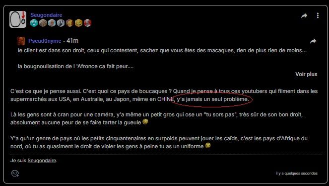 Ça les empêche pas d'être violent. Ok ils ont pas le droit mais concrètement quand t'as le vigile 80 de QI au SMIC qui t'agresse pour se soulager de sa frustration de pas avoir réussi à être flic et avoir un taff de merde, tu fais quoi?