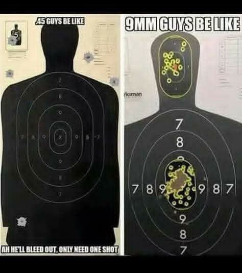 Une 9x19 avec une balle goldot de chez Feredal à pouvoir d'arrêt comparable à certaines balles de 45acp, c'est pas pour rien que tous les services de Police dans le monde utilise du 9x19.