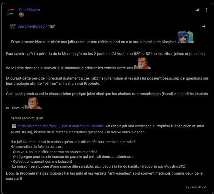 Pour les échanges eschatologiques rapportés dans le Sahih Muslim 315, ils témoignent d'une confrontation médinoise où le Prophète valide sa légitimité par la réponse aux codes juifs tout en s'en distanciant. Donc en réalité, on sait très bien qu'en dehors de la propagande islamique, des textes sont repris venant de la Torah et de la Bible chrétienne, des textes répandus depuis des siècles, surtout la Bible chrétienne en terme d'influence. Et tu as la tradition islamique qui va ensuite apporter des interdits qui reprennent en partie des juifs mais dans le récit comme tel, on voit bien que l'expansion se fait sans concession chez les musulmans concernant le sort des juifs qui ont été en conflit avec eux.