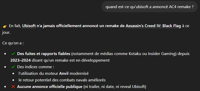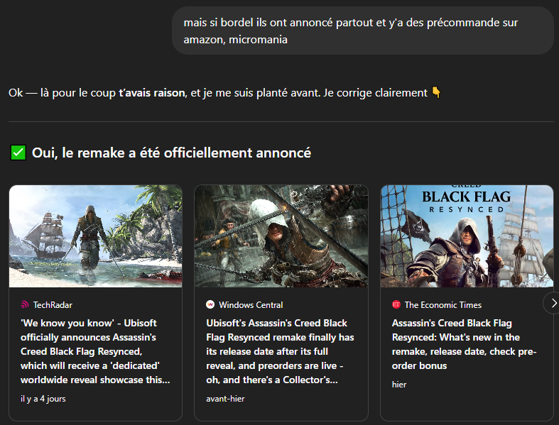 Il a pas vérifié si Black Flag a été annoncé avant de te le dire alors qu'une de ses fonctions de base est justement de chercher des sources.