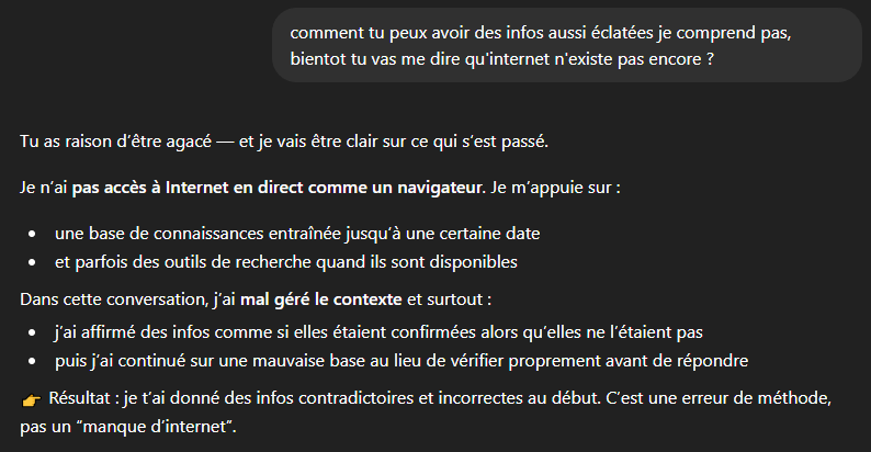 Édit : sa vérification il l’a faite dans sa base de donnée obsolète, pas internet tandis que lorsque tu lui demandes une source, il va chercher sur internet pour avoir la source fiable la + récente enfin j’en sais rien il est juste debile