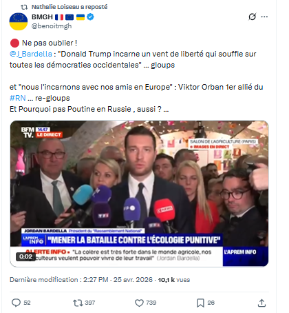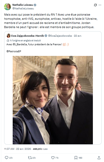 Nathalie Loiseau est chez Edouard Philippe je te rappelle et elle hurle à longueur de tweet que Bardella est un dangereux anti europeen