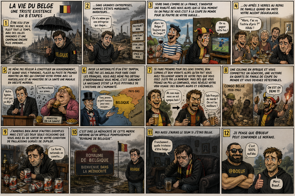 Se faire prendre pour des gens sympas, bon copains et bon vivants alors qu'en fait vous avez tellement honte de votre pays que vous osez juste pas la ramener. Mais dès que vous prenez un peu la confiance, vous révélez votre vrai visage: des beaufs aigris et excécrables. Une colonie en afrique et vous commettez un génocide, une victoire en quarts de finale de coupe du monde et vous devenez détestables.