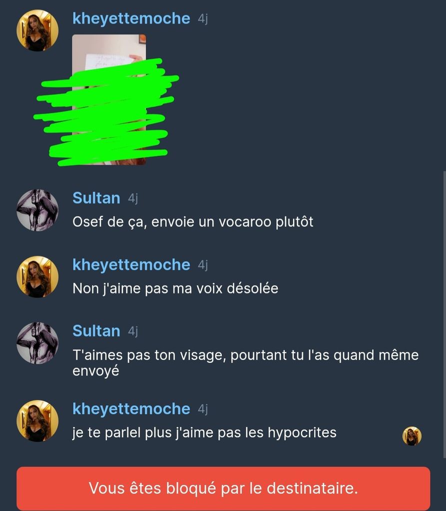 Je lui ai demandé de m'envoyer le vocaroo, elle m'a bloqué.