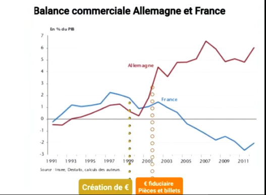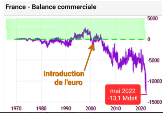 De plus, je rappelle que là où les pays du sud souffrent de l'euro, les pays du nord notamment l'Allemagne en bénéficient. Pour une raison simple. A savoir que l'euro a un taux de change par rapport au dollar sur les marchés internationaux qui se situent en dessous de ce que serait le taux de change du deustsche mark ou encore du florin néerlandais s'il n'y avait pas eu l'euro. Cependant, le taux de change de l'euro par rapport au dollar est supérieur aux taux de change du franc pour la France, de la lire pour l'Italie, du drachme pour la Grèce, la peseta espagnole ou encore l'escudo portugais auraient été s'ils étaient des monnaies évoluant librement avec donc taux de change flexible. Puisque l'euro coûté moins cher sur les marchés internationaux que ce que coûterait le deutshche mark, cela veut dire que l'Allemagne a pu grandement exporté et donc renforcer son économie tout en faisant diminuer son chômage. C'est pourquoi les conséquences de la désindustrialisation se sont fait moins ressentir aussi en Allemagne par rapport en France. A cela s'ajoute les tendances démographiques différentes. Et l'Allemagne a pu limité les conséquences de désindustrialisation grâce au fait que l'euro soit une monnaie trop bon marché pour l'Allemagne. Les excédents commerciaux de l'Allemagne ont été énormes pour cette raison précise. En 2011, c'était même un excédent commercial plus élevé que l'excédent commercial chinois. Bien sûr, les événements en Ukraine en 2022 contribuent à modifier cet état de fait. Pour les pays du sud, c'est le contraire puisque le taux de change de l'euro est trop élevé par rapport à la compétitivité intrinsèque de leurs économies. Il n'est pas étonnant qu'au contraire de l'Allemagne, ces pays accumulent des déficits commerciaux. Le fait que la France souffre de déficits commerciaux importants se traduit d'une part par une perte de compétitivité de notre économie et d'autre part part une hémorragie de nos emplois industriels.