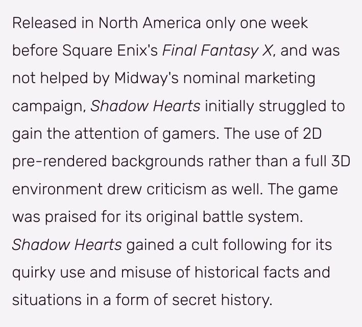 Les shadow hearts sans hesitation l'élite du jrpg en depit de ces sans gout de square fag qui ventaient en masse les merites de cette immense merde qu'est final fantasy 10