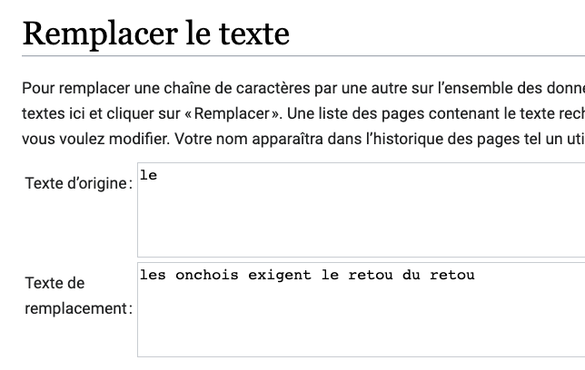 Je remplace la totalité des occurences du mot "le" sur JVFlux par "les onchois exigent le retou du retou"