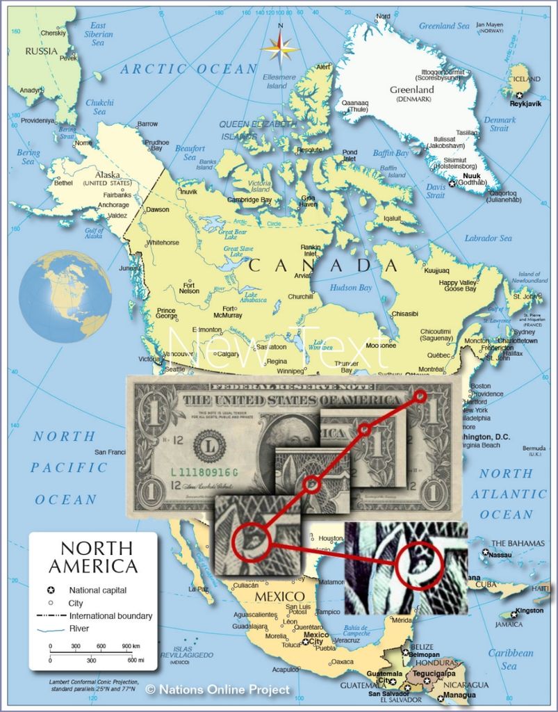 Le hibou se trouve aussi sur le billet de 1$ américain. En superposant ce billet sur les USA, le hibou est en direction du Québec.