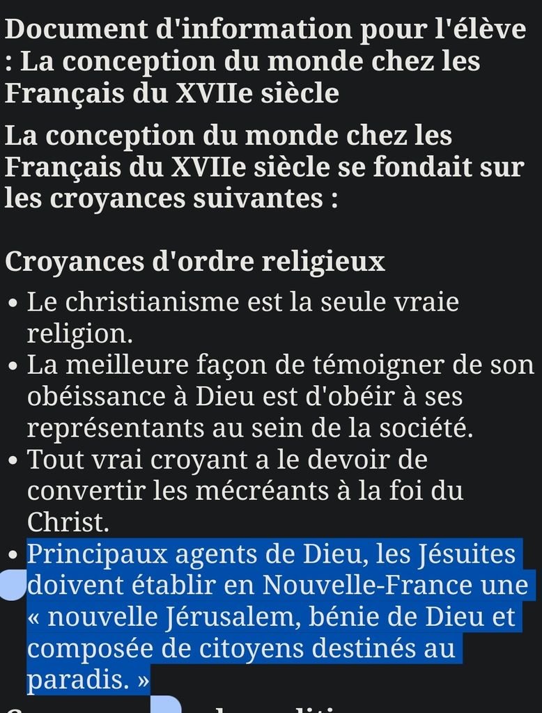 Le but des Jésuites à l'époque était de faire de la Nouvelle France la nouvelle Jérusalem. En d'autres mots créé un peuple destiné au paradis dans le future.