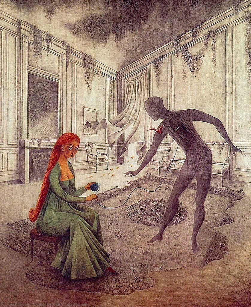 la bourrasque de vent qui entre dans cette piéce lugubre et triste représente surement la vraie liberté et le bonheur, à portée de main, mais que cette femme esseulée semble ne même pas calculer, elle préfére s'acharner à trouver l'amour et le bonheur dans l'artificiel et le faux. En déroulant ce fil, cest elle même qu'elle détricote.