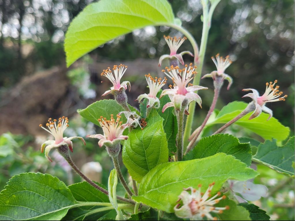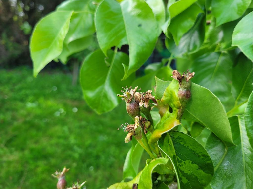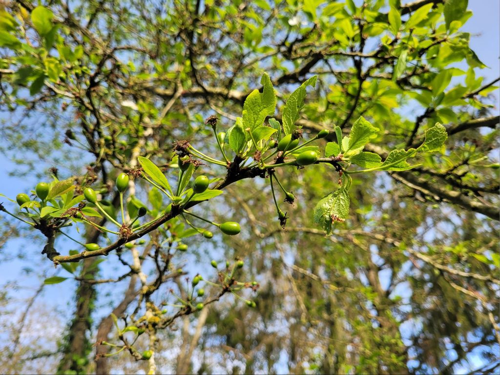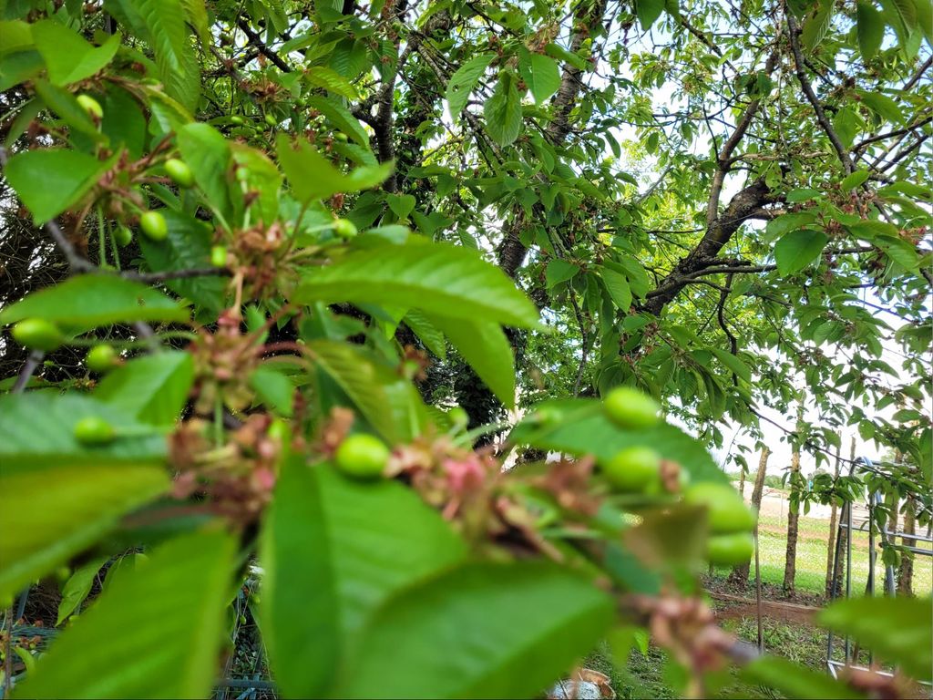 Au premier plan le pommier reine des reinettes qui pollinise les autres, à gauche un pêcher redheaven, 2 pommiers celui du milieu cache l'autre derrière jonagold et champion, un poirier conférence (de tète c'est lui le pollinisateur), au centre un prunier mirabelle trentenaire et son rejeton (drageonnage) devant, dans le fond un cerisier bigarreau