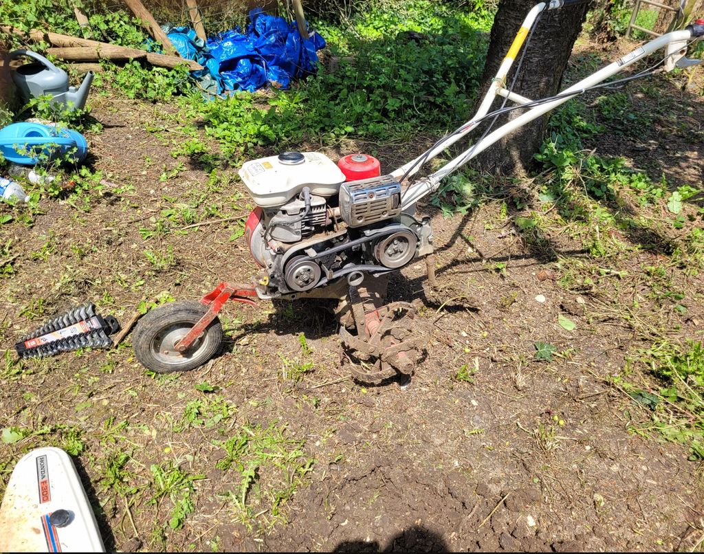 La serre est bachée mais la courroie de l'antique motoculteur Honda est détendue à mort, une nouvelle a été commandée
