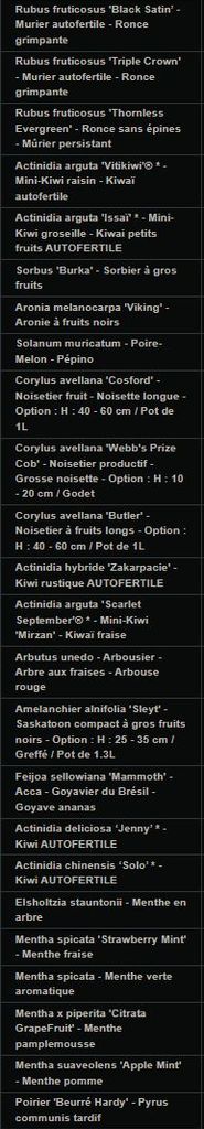 Ici 4 variétés de framboisiers, groseilles cassis casseille etc, 2 muriers platane à droite