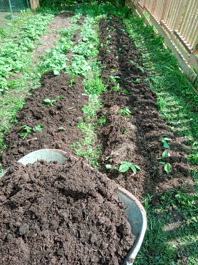 J ai passé une bonne partie de la journée à faire le premier buttage des pommes de terres. J ai fait la moitié soit 100 pieds.