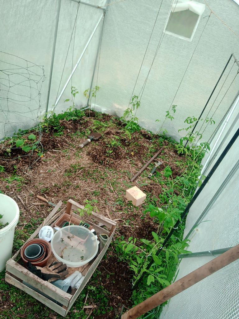 les tomates et tuteurs mis en place. 27 plans dans la grande serre, 8 dans la petite. reste à planté les 6 malheureux poivron qui ont réussi à sortir et 5 autres bidules qui je pensais être des poivrons mais qui me semble être des aubergines (les graines de poivron et d' aubergine ont exactement la même gueule)