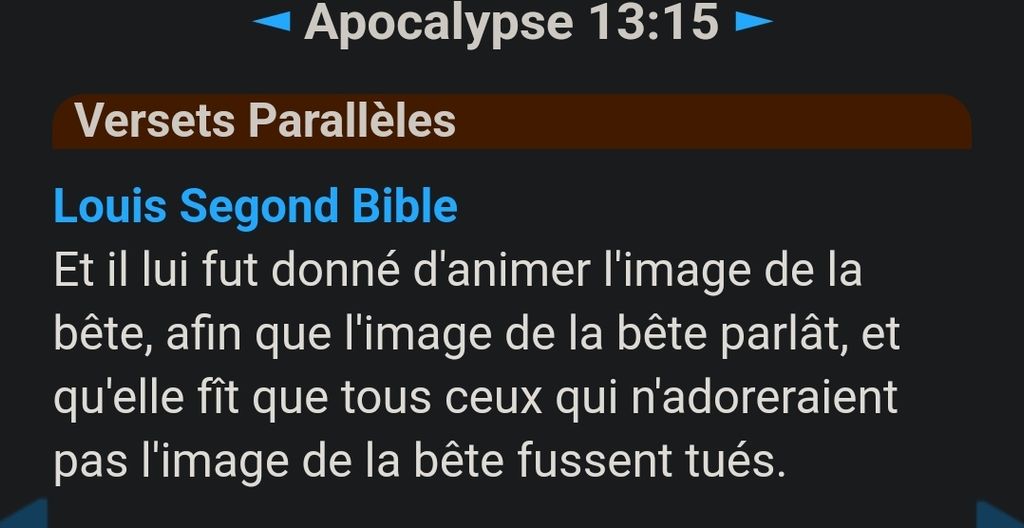Apocalypse 13:15 Et il lui fut donné d'animer l'image de la bête, afin que l'image de la bête parlât, et qu'elle fît que tous ceux qui n'adoreraient pas l'image de la bête fussent tués.