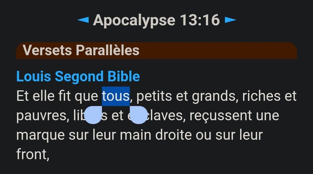 Apocalypse 13:16 Et elle fit que tous, petits et grands, riches et pauvres, libres et esclaves, reçussent une marque sur leur main droite ou sur leur front,