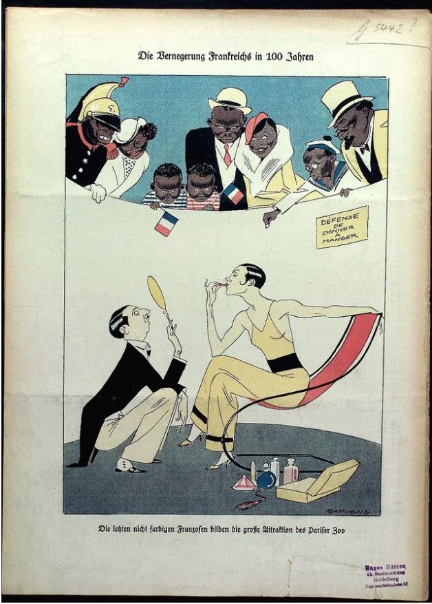 « La France même doit être comptée au nombre de ces États. Non seulement du fait qu’elle complète son armée, dans une proportion toujours croissante, grâce aux ressources des populations de couleur de son gigantesque empire, mais aussi du fait que son envahissement par les nègres fait des progrès si rapides que l’on peut vraiment parler de la naissance d’un État africain sur le sol de l’Europe. La politique coloniale de la France d’aujourd’hui n’est pas à comparer avec celle de l’Allemagne de jadis. Si l’évolution de la France se prolongeait encore trois cents ans dans son style actuel, les derniers restes du sang franc disparaîtraient dans l’État mulâtre africanoeuropéen qui est en train de se constituer : un immense territoire de peuplement autonome s’étendant du Rhin au Congo, rempli de la race inférieure qui se forme lentement sous l’influence d’un métissage prolongé. »