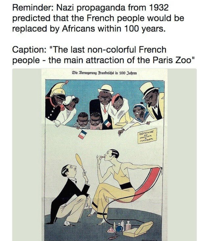 « La France même doit être comptée au nombre de ces États. Non seulement du fait qu’elle complète son armée, dans une proportion toujours croissante, grâce aux ressources des populations de couleur de son gigantesque empire, mais aussi du fait que son envahissement par les nègres fait des progrès si rapides que l’on peut vraiment parler de la naissance d’un État africain sur le sol de l’Europe. La politique coloniale de la France d’aujourd’hui n’est pas à comparer avec celle de l’Allemagne de jadis. Si l’évolution de la France se prolongeait encore trois cents ans dans son style actuel, les derniers restes du sang franc disparaîtraient dans l’État mulâtre africanoeuropéen qui est en train de se constituer : un immense territoire de peuplement autonome s’étendant du Rhin au Congo, rempli de la race inférieure qui se forme lentement sous l’influence d’un métissage prolongé. »